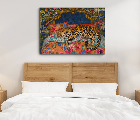 Blue & Terracotta Sleepy Leopard In a Vintage Bed