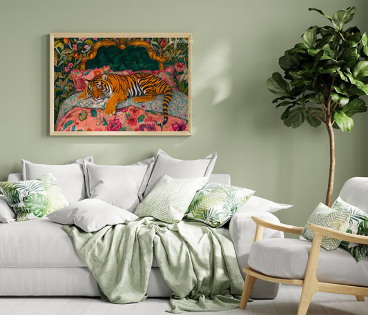 Sleeping Tiger in Bed Art Print – Maximalist Jungle Wall Art, Bold Animal Decor, Tiger Bedroom Poster, Rest Aesthetic, Gift for Her