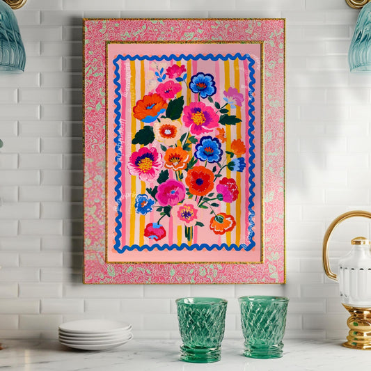Bold Bright Floral Bouquet Wall Art – Colorful Flower Poster with Pink Stripes & Blue Border – Cheerful Art Print for Living Room