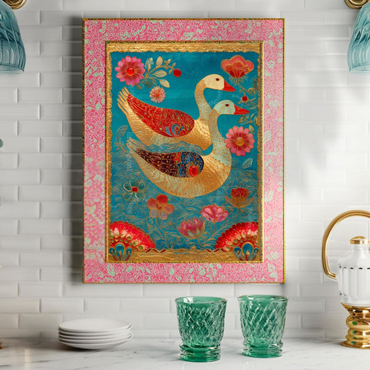 Whimsical Bird Wall Art – Turquoise and Gold Surreal Print, Maximalist Floral Decor, Folk-Inspired Goose Art for Eclectic Gallery Walls