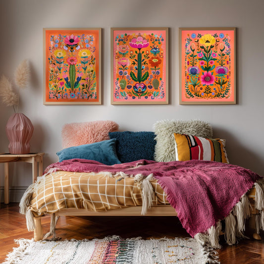 Cactus Wall Art Set of 3 – Bold Southwestern Prints Mexican Folk Art Desert Decor Orange Boho Gallery Wall Funky Over Couch Art Orange