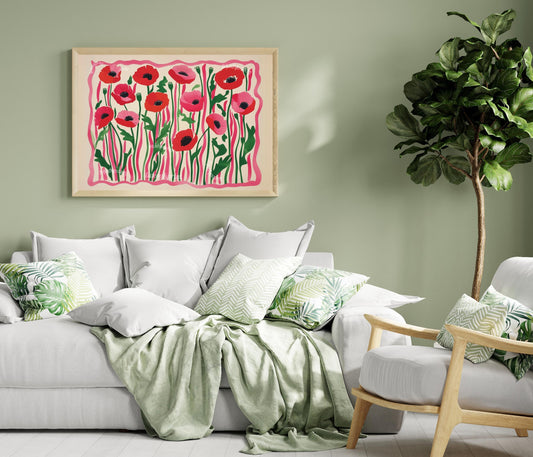 Bright Flowers Wall Art – Pink and Green Pastel Print Cozy Cottagecore Bedroom Decor – Botanical Wall Art Soft Pink Floral Print