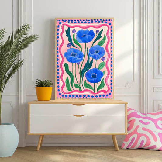 Red and Pink Floral Wall Art Set of 2 – Pink and Blue Flower Prints Boho Botanical Wall Decor Coquette Bedroom Art Bold Maximalist Decor